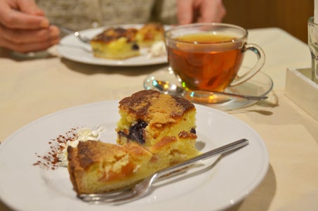 今回はティーセットを頂きました。2種類のタルトとドリンクのセットです。タルトはチェリー(かな)とフキの2種類。フキの甘煮のタルトとは珍しいかも♪