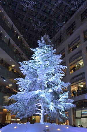 丸ビルのお隣にあるKITTEビルのクリスマスツリーは、雪をまとった幻想的なスタイルです。ビル中央の吹き抜けになっている場所にドーンと展示されているので迫力満点。時間になるとミュージックに合わせてライトアップのショーも行われていました☆
