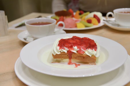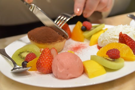 ゲスト様のプレートはいろんな果物が添えられていて、さらにティラミスのタルトやアイスもセット。私のショートケーキは少し固めのスポンジ生地が牛乳に浸されていて、2層のスポンジの間にバニラアイスをサンド、飾り付けに生クリームとイチゴジャムに彩られたケーキです。