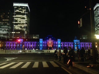 東京駅開業100年記念として12月24日より丸の内駅舎の特別ライトアップが始まったそうです。オレンジやブルー、パープルの鮮やかな光が駅舎を照らしていました。